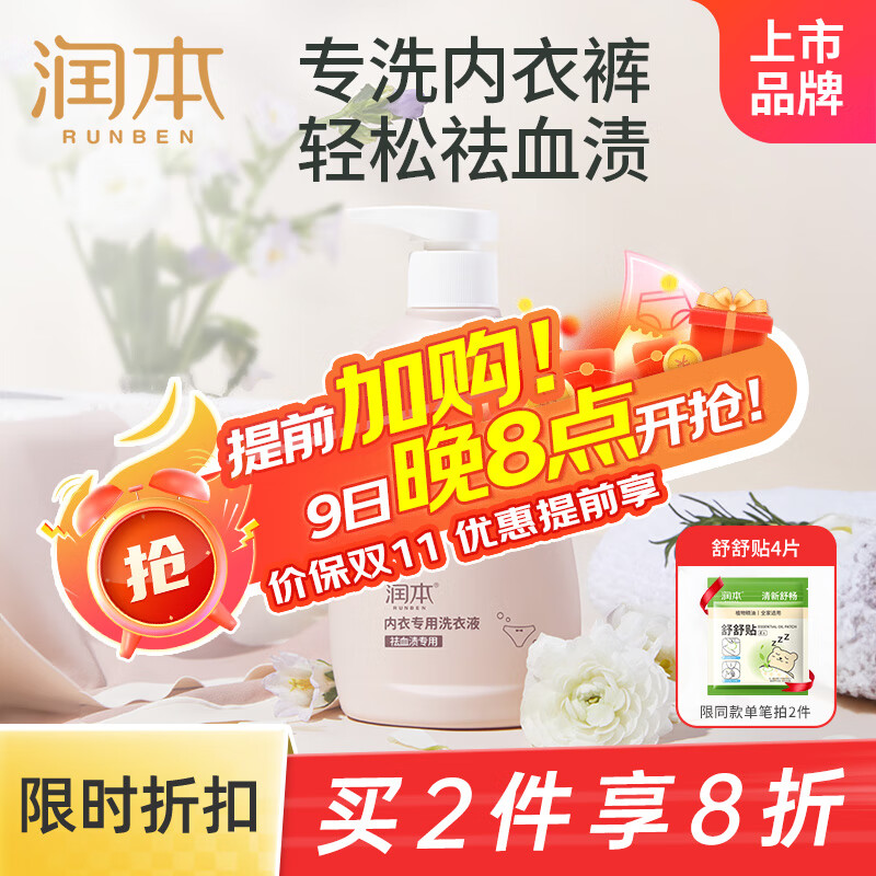润本(RUNBEN)内衣内裤洗衣液300ml生理期去血渍除菌抑菌除螨男女通用机洗手洗