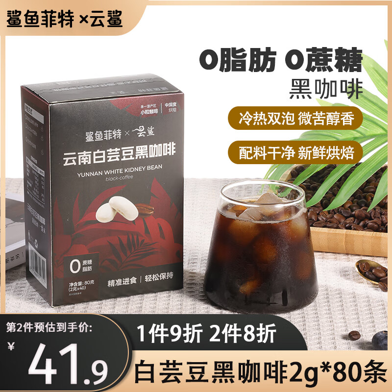 鲨鱼菲特 白芸豆黑咖啡粉0脂0蔗糖美式速溶云南小粒咖啡 白芸豆黑咖啡80条赠冰川杯