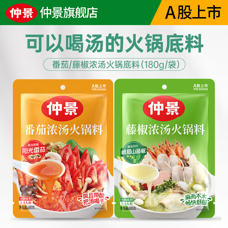 仲景 浓汤火锅底料 鸡汤麻辣香锅藤椒火锅麻辣烫米线茄汁面调味底料 番茄味180g+藤椒味180g