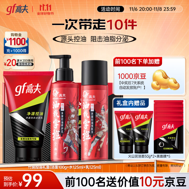 高夫净源控油男士护肤三部曲(洗面奶100g+水125ml+乳125ml)送男友礼物