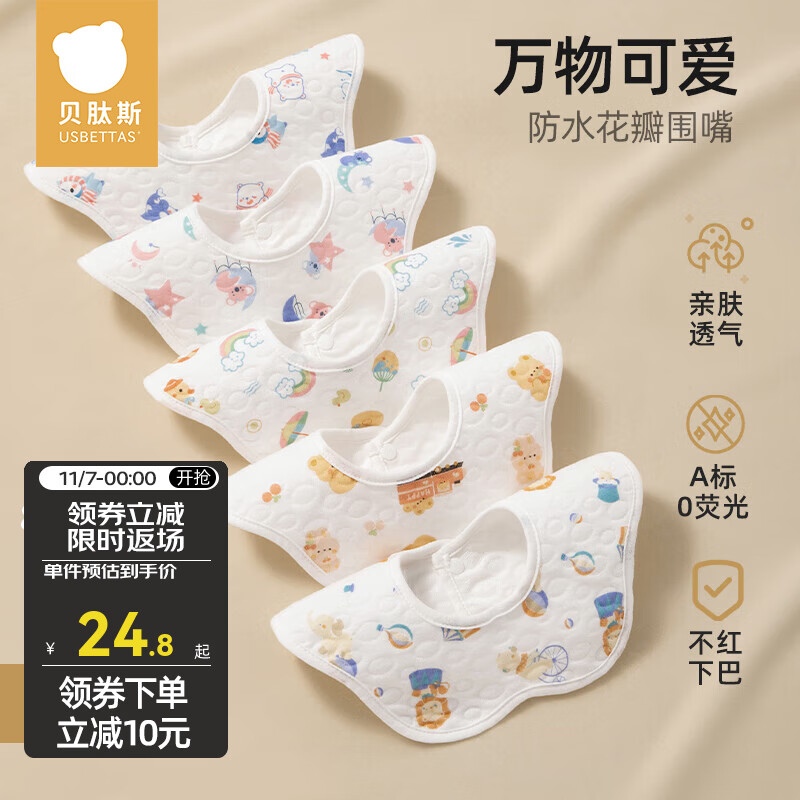 贝肽斯口水巾婴儿围嘴新生宝宝纯棉防水吐奶吃饭春夏款柔软透气围兜脖围 万物可爱(花瓣款 5条装) 通用