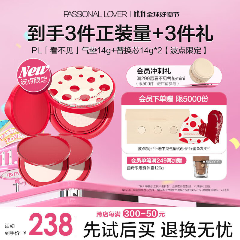 恋火(Passional Lover)PL波点限定看不见气垫01色 干皮粉底液遮瑕BB霜 正装*1+替换装*2