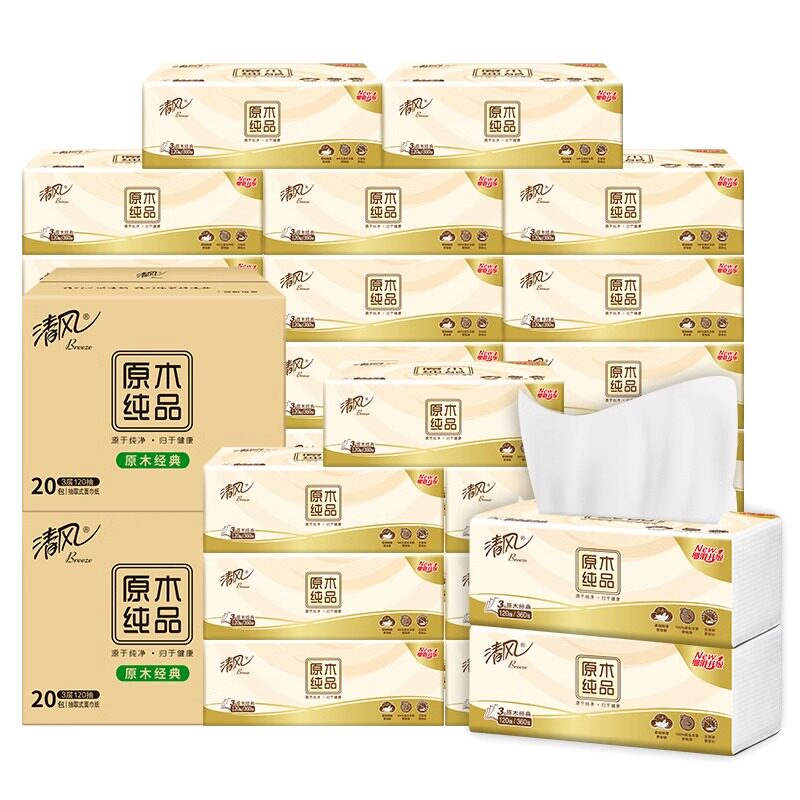 清风原木抽纸3层120抽20包整箱抽纸面巾纸家用实惠装餐巾纸擦手纸